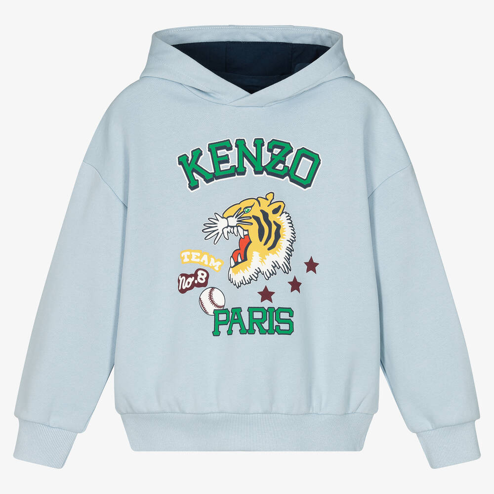 Pale blue hoodie for boys by KENZO KIDS, made in soft mid-weight cotton jersey with a fleecy inside. Drawing inspiration from varsity teams, this casual piece features the brand's roaring Varsity Tiger motif on the front outlined with a KENZO PARIS logo. It has sporty ribbed trims and a cosy jersey-lined hood.