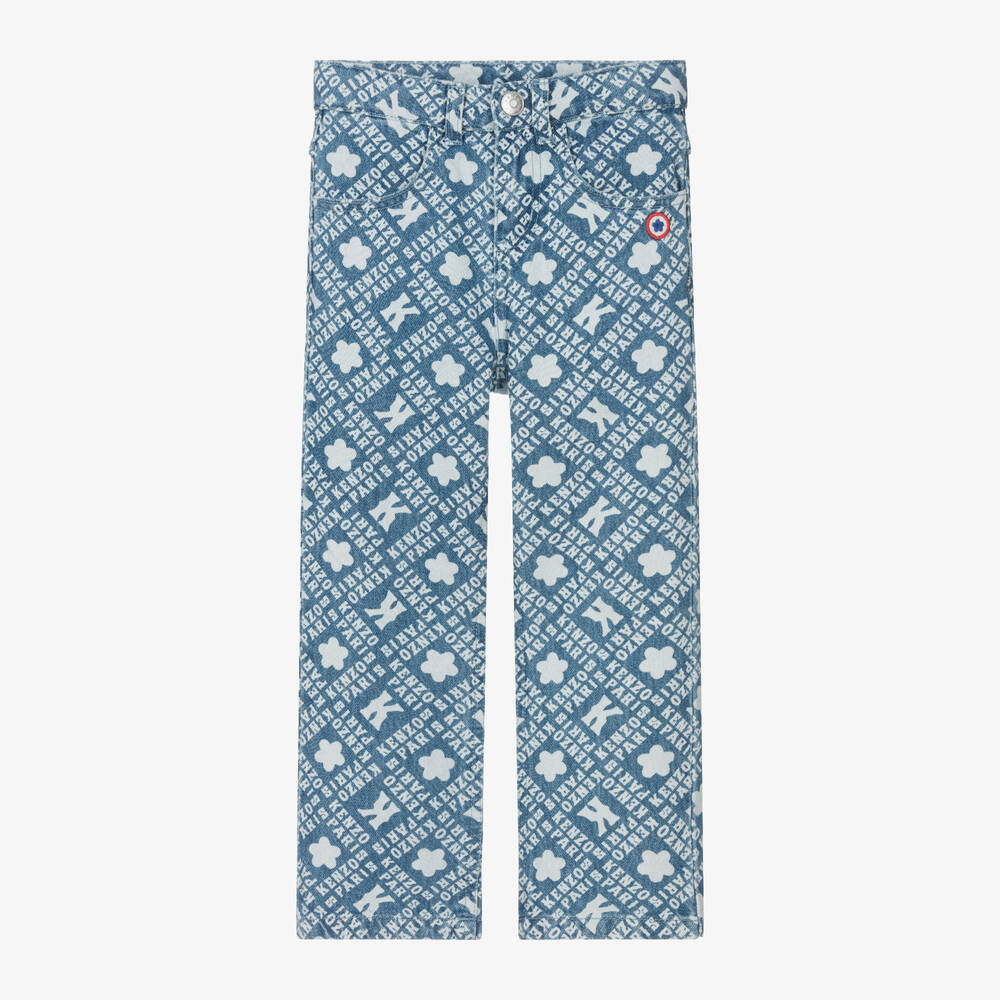 Four-pocket jeans for boys by KENZO KIDS, in a mid-blue wash. The cotton denim fabric is enhanced by repeat branding for signature designer styling. These straight-fit jeans have the KENZO Target as an embroidered badge on one side, adding extra brand detailing. They have an adjustable waist for a great fit and fasten with a front logo popper and zip.