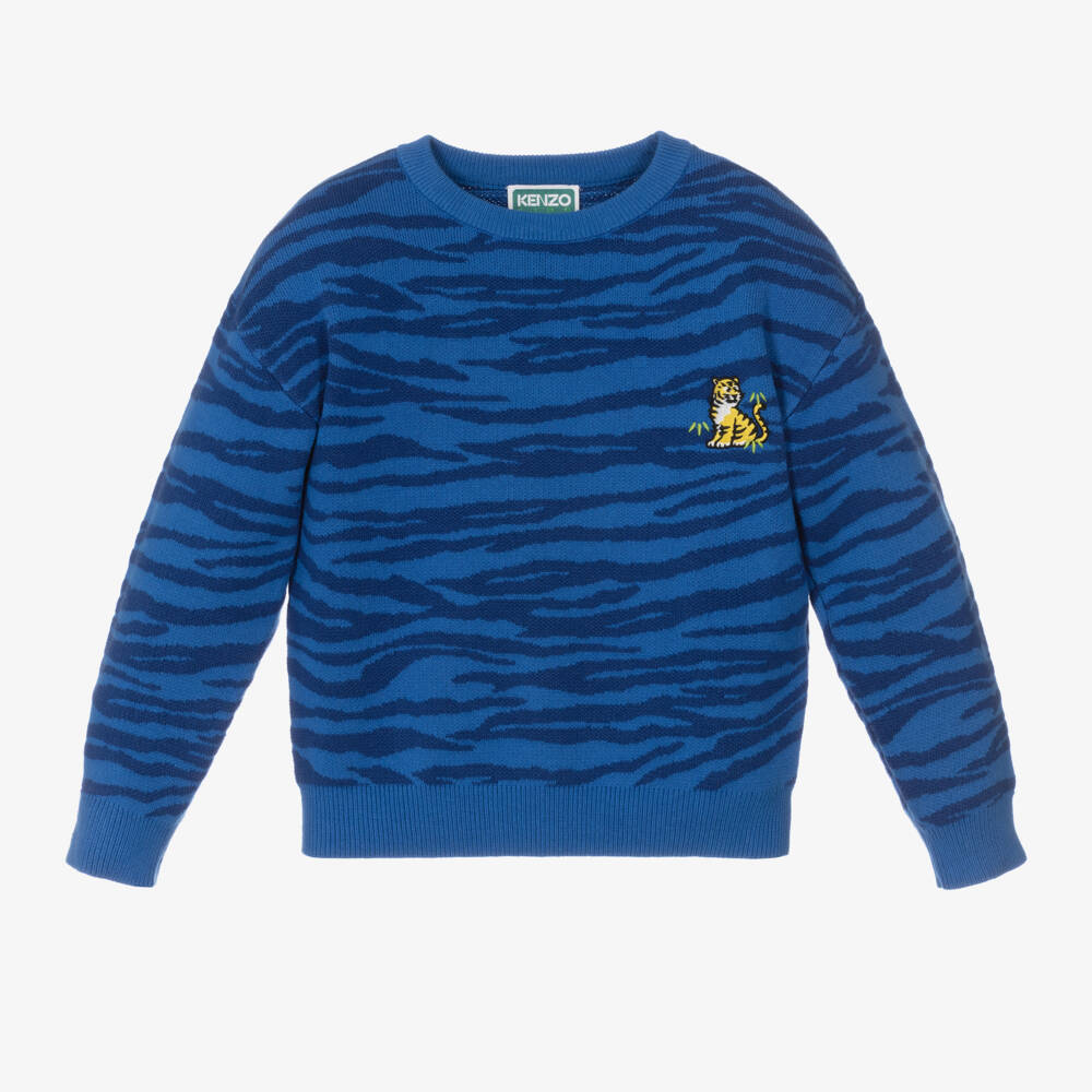 Fun blue sweater for boys by KENZO KIDS in a mid-weight knit. Patterned in animal stripes, there is a sweet Kotora Tiger on the chest, with a Tiger Tail logo on the back, both embroidered in eye-catching yellow.