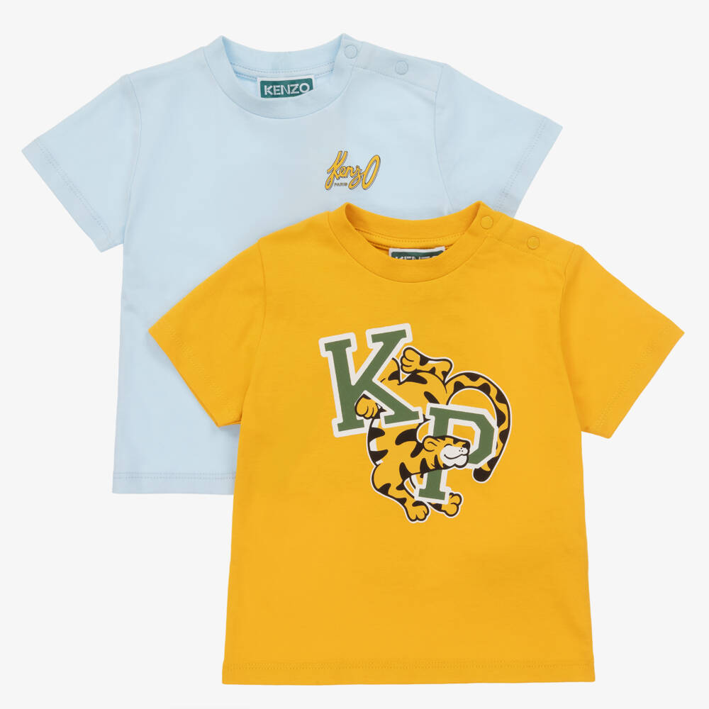 Pack of two blue and yellow T-shirts for little boys by KENZO KIDS, made in soft organic cotton jersey. The blue tee has a fun crocodile graphic printed on the back and the yellow tee has the iconic Tiger logo on the front. Both pieces feature the Kenzo signature logo in yellow. These casual T-shirts have short sleeves and branded popper fastenings on one shoulder.