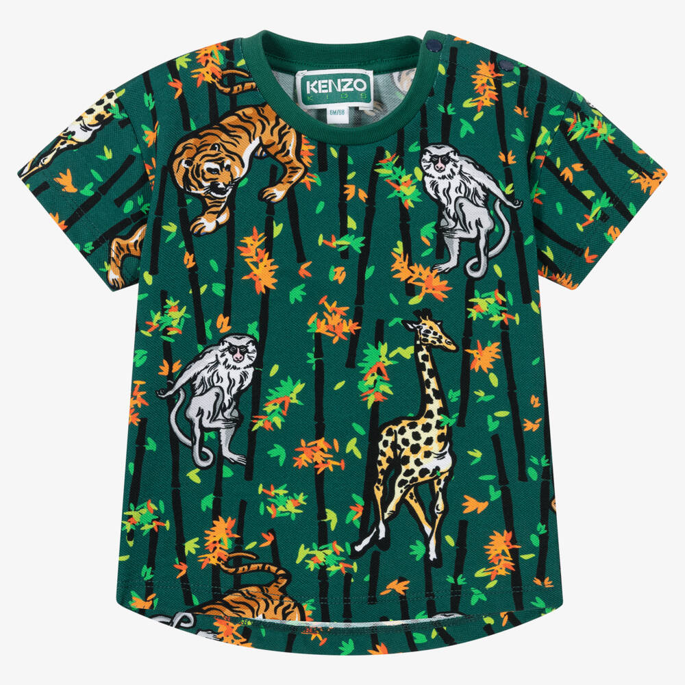Green T-shirt for little boys by KENZO KIDS, made in soft cotton piqué. Reflecting house codes, it has an all-over bamboo jungle print, with giraffes, tigers, and monkeys. Logo poppers on the shoulder help to make dressing fuss-free too.