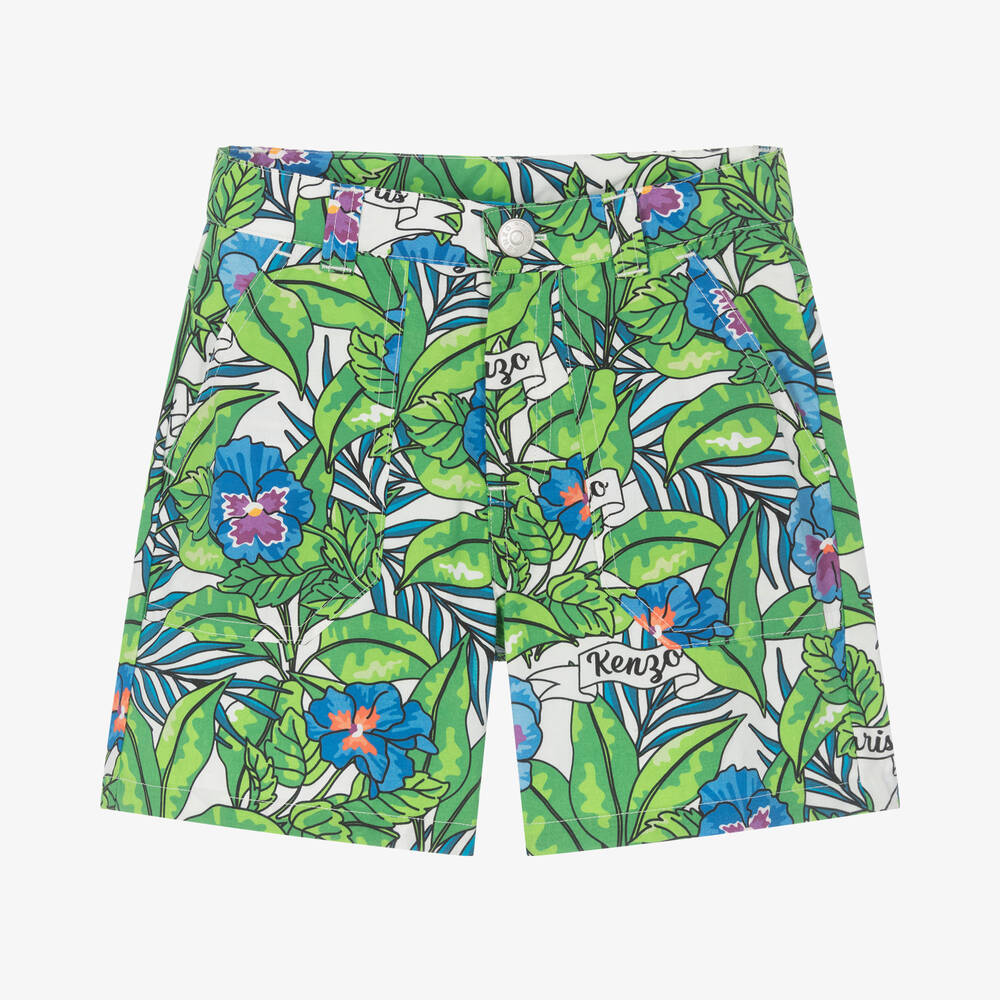 Boys casual white cotton shorts by KENZO KIDS, patterned with the brand's bold green and blue cartoon flowers. Made in soft and lightweight poplin, they have two front pockets and two back pockets. A Kenzo Paris script logo can be seen throughout the pattern for an unmistakable designer finishing touch. They fasten with a branded silver popper and zip on the front and have an adjustable waist for a comfortable fit.
