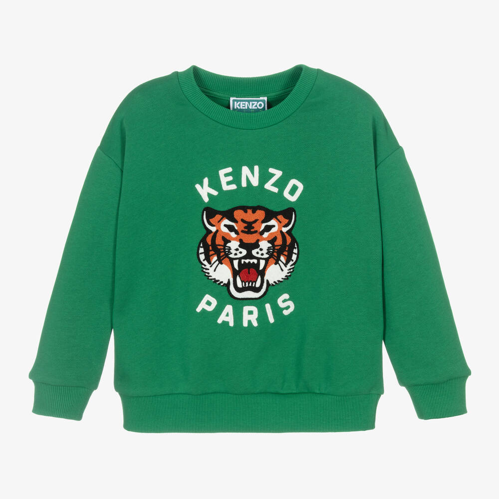 Boys green sweatshirt by KENZO KIDS, made in a mid-weight cotton jersey blend. This Lucky Tiger top has the Kenzo Paris logo on the front in white, chain stitch embroidery.