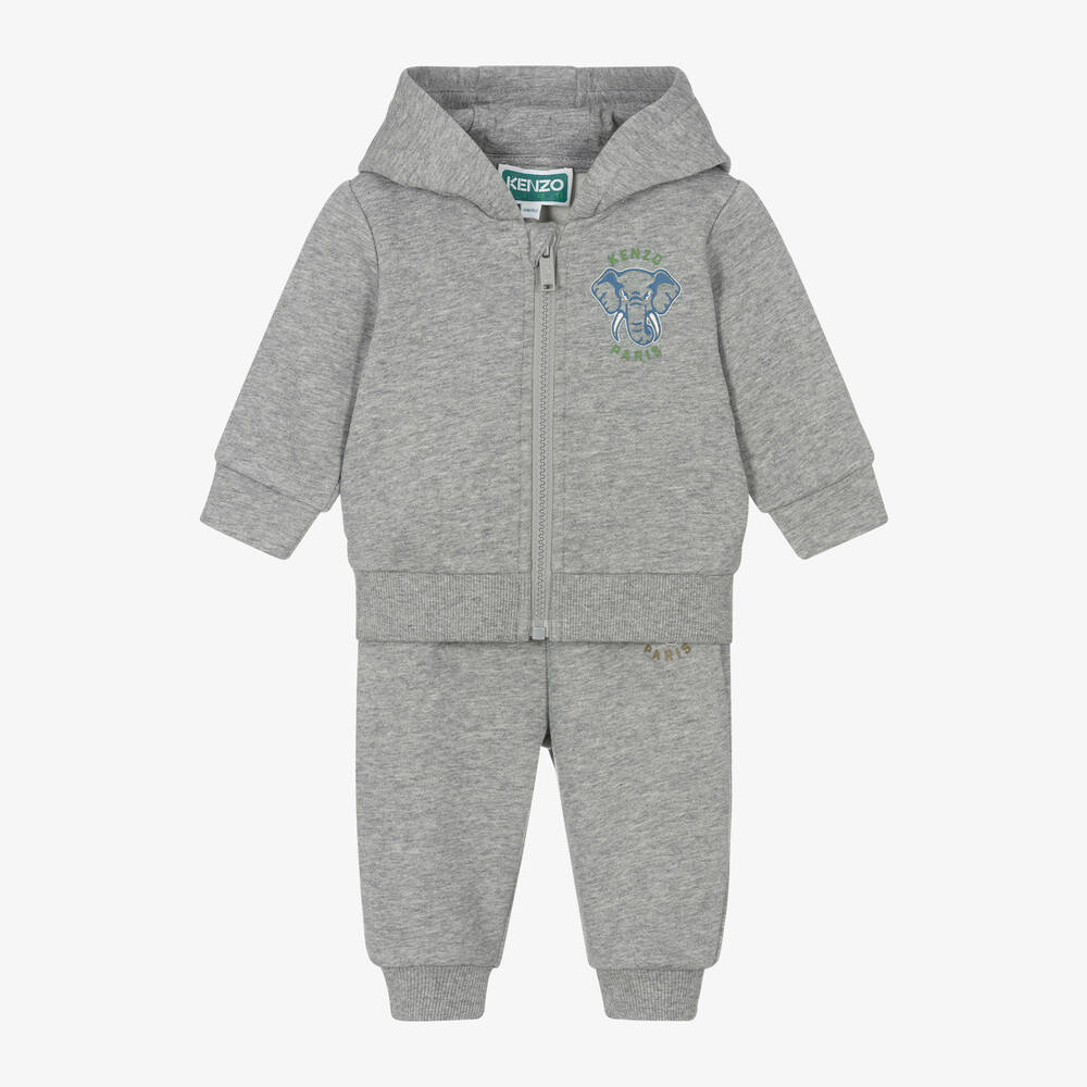 Comfortable for casual days, this grey marl tracksuit for younger boys is by KENZO KIDS. Made from cotton-blend jersey with a soft and fleecy underside, both pieces are printed with the Elephant logo motif for a coordinating look. The long-sleeved top has a cosy hood, a zip fastening with a chin guard on top and pockets on the side seams. The joggers have ribbed ankle cuffs and an elasticated drawstring waistband.