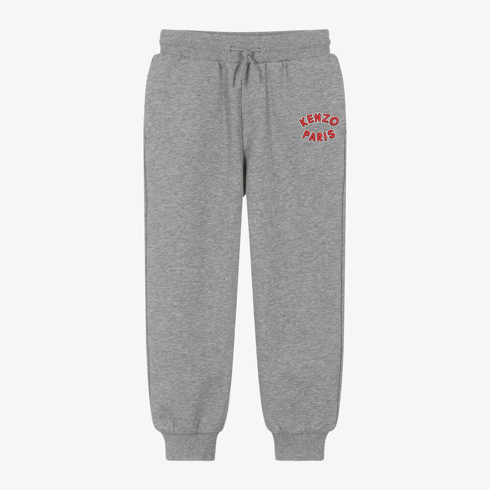 Cool grey marl cotton joggers for boys by luxury French brand KENZO KIDS. For instant brand recognition, they have a red embroidered logo on the front and a travel-inspired logo patch on the back. Casual and relaxed, they are made in soft, comfortable jersey with a warm, fleecy inside and cosy, ribbed trims. They fasten with a drawstring for a great fit.