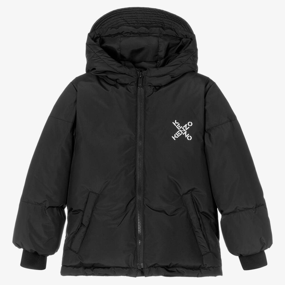Dark grey jacket for boys by KENZO KIDS, made in smooth nylon. Warmly padded with down, it has a small X logo printed on the front in white, with a matching Big X logo on the back. The fixed hood has a peak and there are front pockets and an internal drawcord on the hem. It has ribbed cuffs to keep in the warmth.