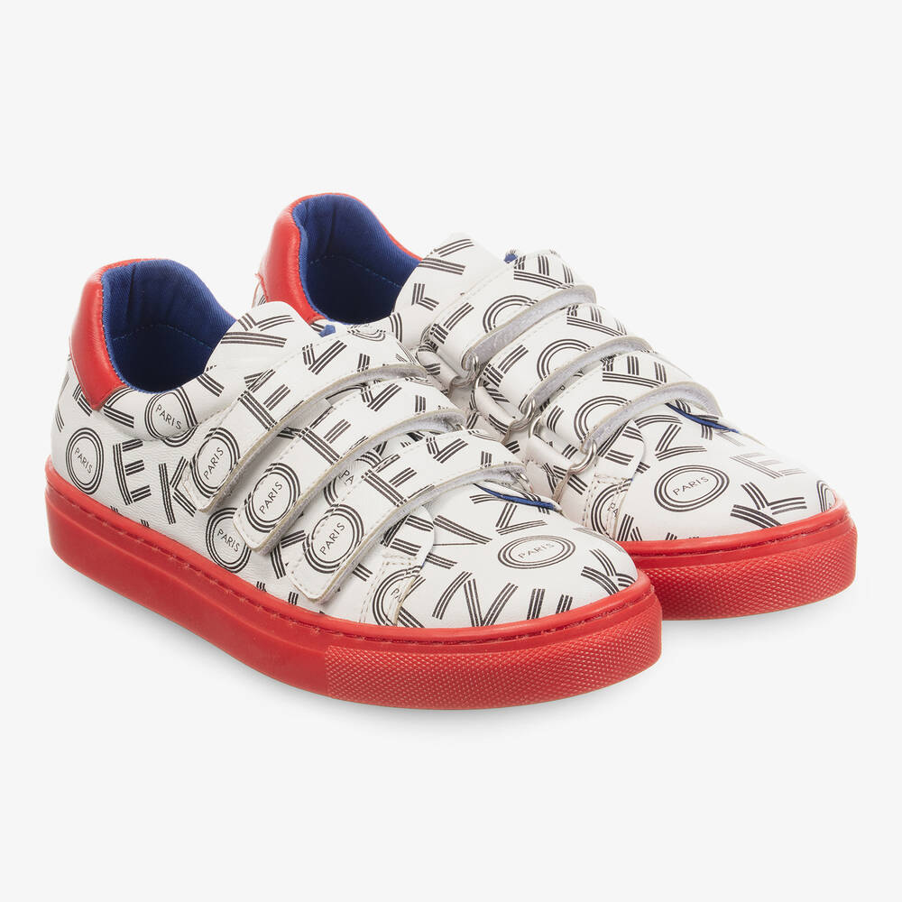 Boys white leather trainers by Kenzo Kids with a black logo print and red soles. They have velcro fastenings and blue lining.