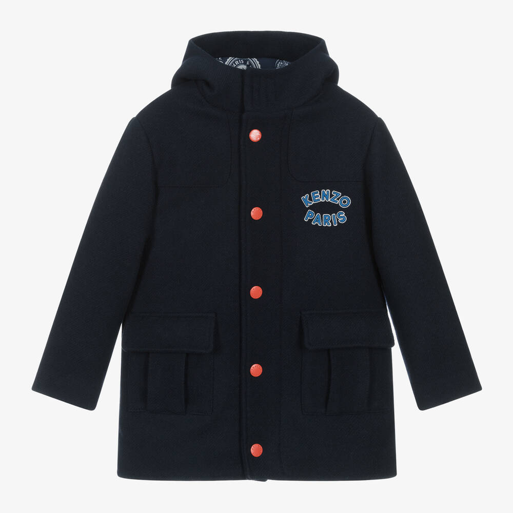 Navy blue wool-blend coat for boys by luxury French brand KENZO KIDS, with an embroidered, contrasting blue logo on the front. Ideal for chilly days, it has a fixed hood with a velcro fastening under the chin, lightweight padding and front pockets that fasten with poppers. There is a zip fastening on the front with a flap over for extra protection against the weather, secured with red, branded poppers. The comfortable, navy blue lining has a travel patch-inspired print.