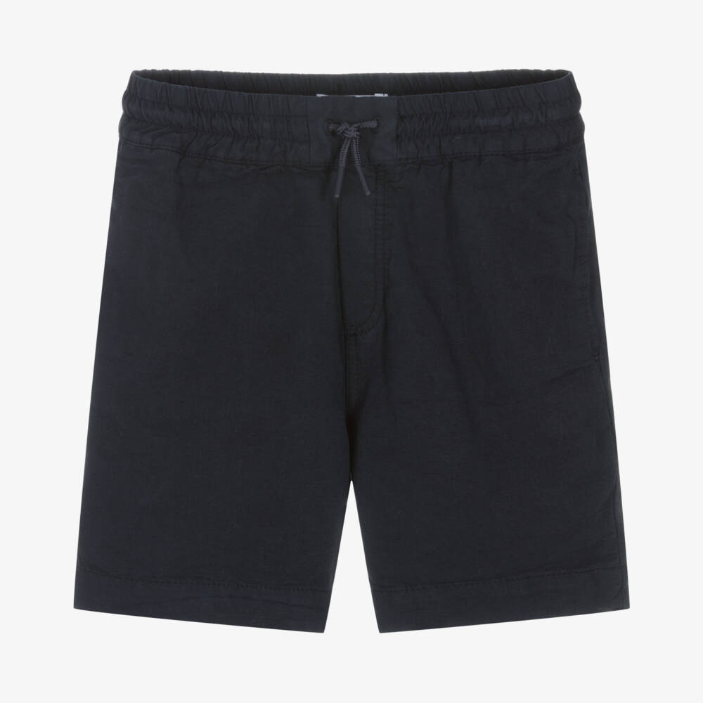 Cool navy blue twill shorts for boys by KENZO KIDS, made in a soft blend of linen and cotton. The signature yellow and black KOTORA Tiger logo is embroidered on the back pocket, for a seasonal logo-inspired look. Promising comfort and casual style, they have a stretchy drawstring waist.