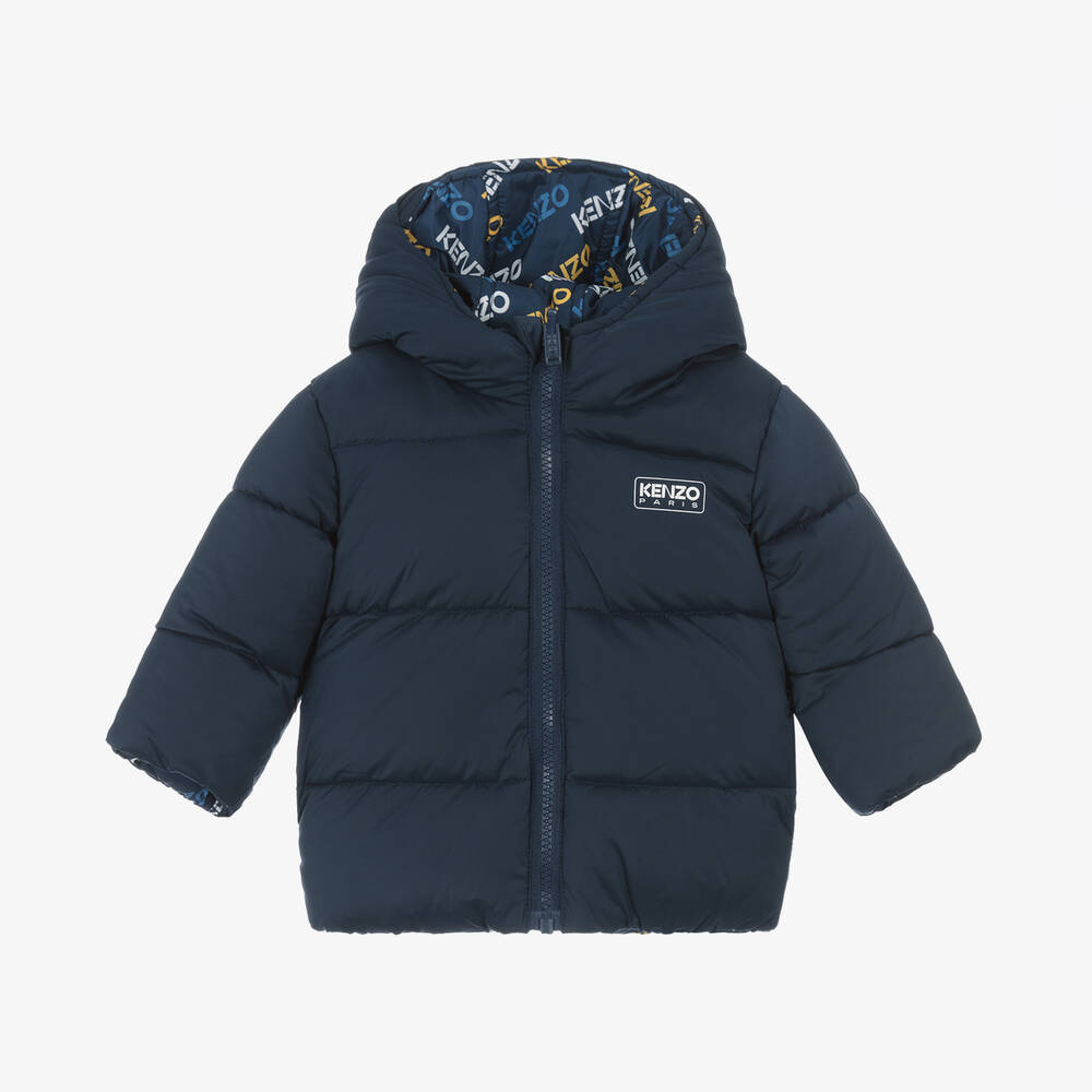 A reversible navy blue hooded puffer coat for younger boys from KENZO KIDS. One side has white Kenzo Paris logo prints on the front and back, while the other side has a blue, yellow and white all-over print. Fastening with a colour-matched zip, this practical outerwear piece is silky smooth with a water repellent finish. It has warm padding and side seam pockets on both sides.