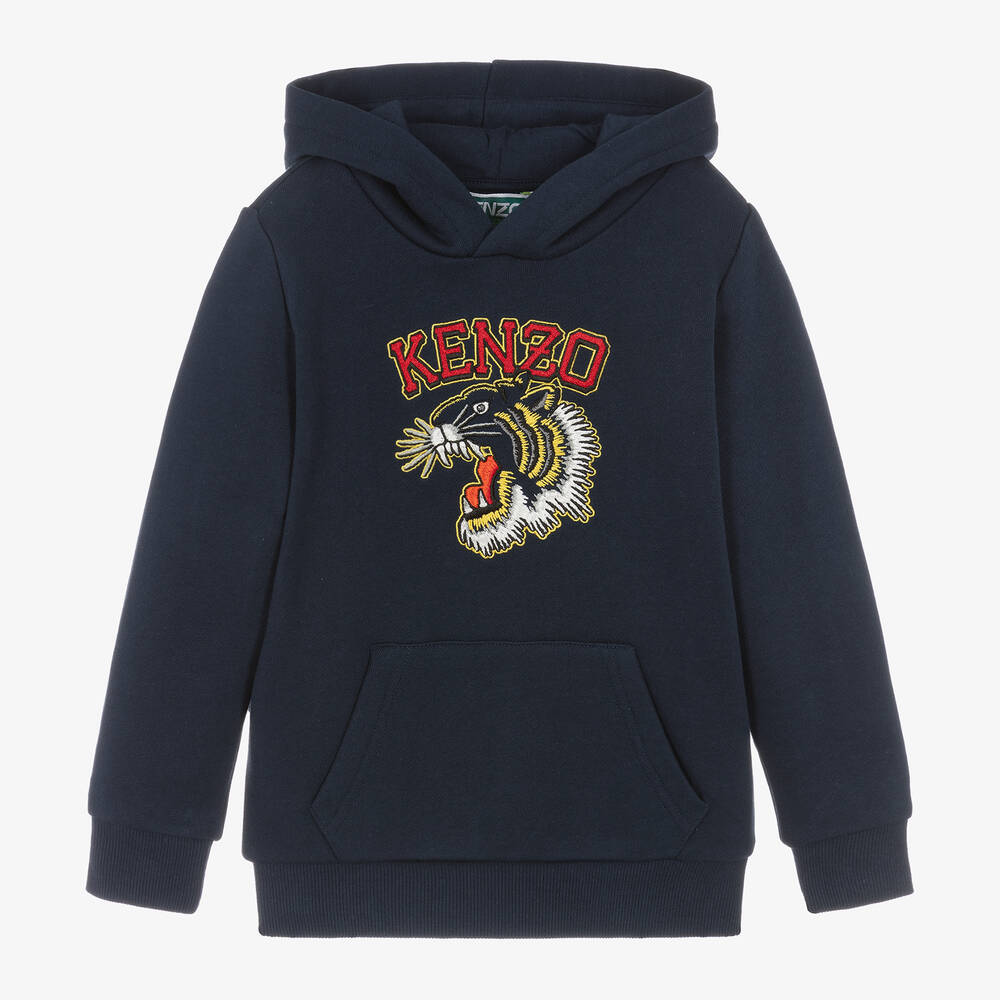 Navy blue hoodie for boys by KENZO KIDS, made in mid-weight cotton jersey with a fleecy inside. An instantly recognisable design, this casual top is embroidered with collegiate-style lettering and the iconic Varsity Tiger. It has ribbed detailing around the cuffs and hem and a jersey-lined hood for added comfort. There is a roomy pouch pocket on the front, ideal for carrying items or keeping hands warm.