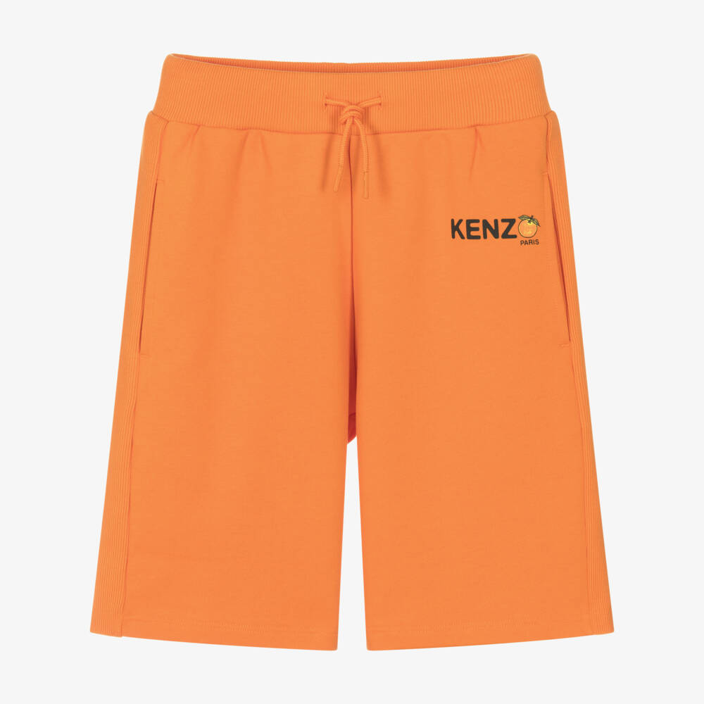 Casual orange shorts for boys by KENZO KIDS, printed with a fruit logo design for instant brand appeal. Made with organic cotton, these jersey shorts have comfortable ribbed trims and useful side seam pockets. The drawstring waist can be adjusted for a great fit.