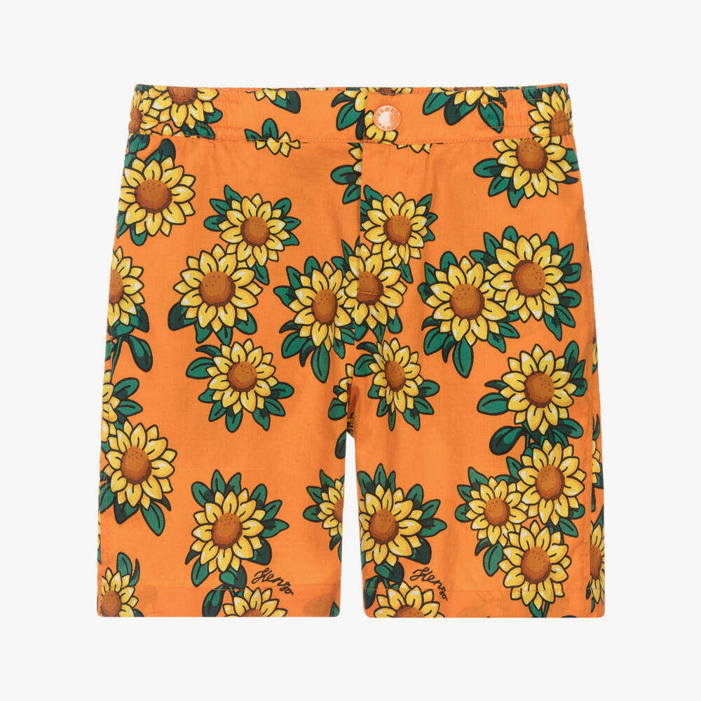 Vibrant orange Bermuda shorts for boys from KENZO KIDS, patterned with bold yellow and green sunflowers and black script logos. Made in lightweight cotton sateen, they have an elasticated waistband and fasten with a zip and branded popper. Side seam pockets and two back pockets add a practical finish.