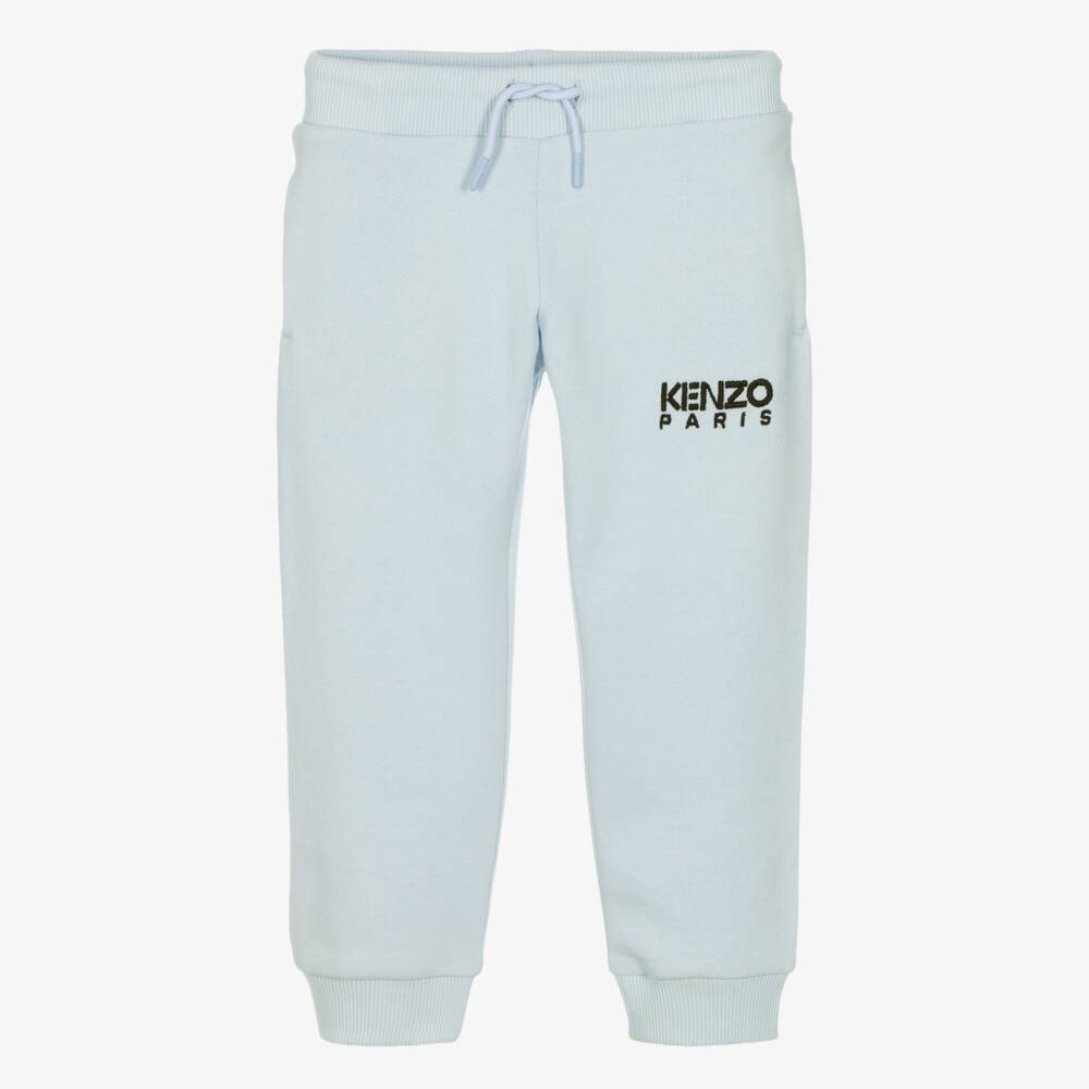 Cool pale blue cotton jersey joggers for boys by KENZO KIDS. They are comfortable with an elasticated waist and cuffs, the waist of which can be adjusted with a drawstring for a better fit. The Kenzo Paris logo is embroidered on the front in black for a branded finish.