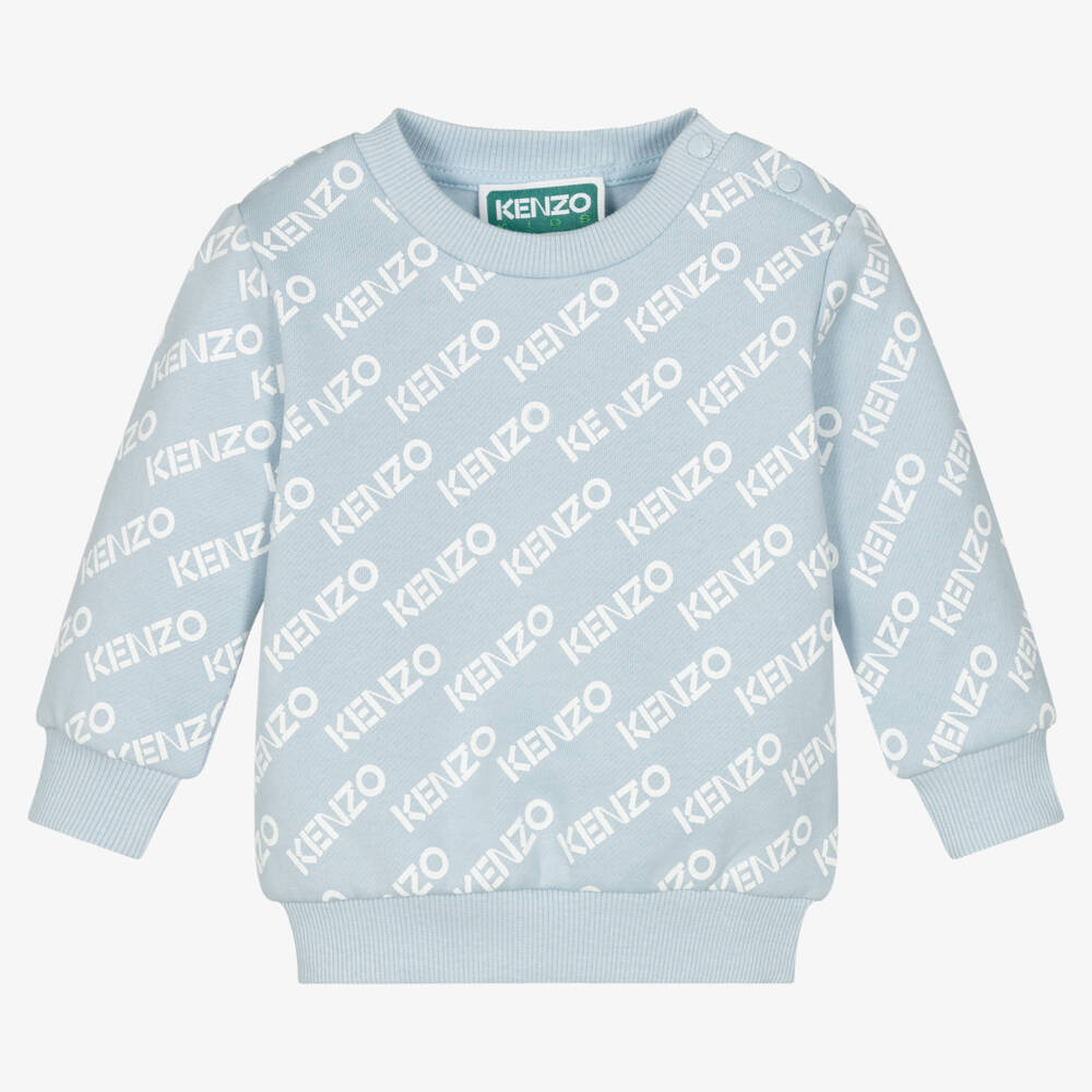 Pale blue sweatshirt for little boys from KENZO KIDS, with a white logo pattern. Made in comfortable cotton-blend sweatshirt jersey with a cosy fleece feel inside, it has soft ribbed trims and useful branded popper fastenings on one shoulder.