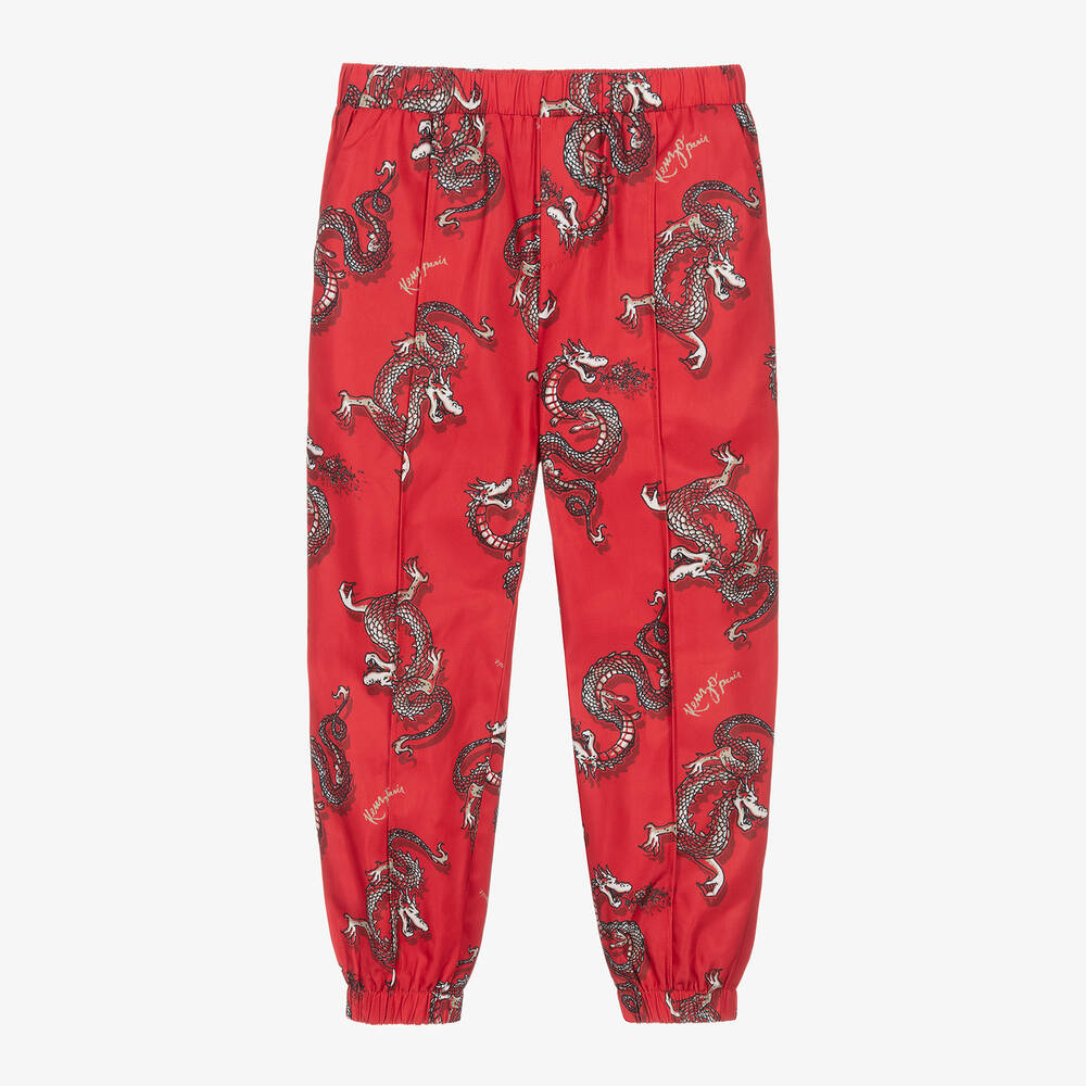 Stylish red trousers for boys by luxury French fashion house KENZO KIDS, made in silky satin twill. This comfortable party look is designed with an elasticated waistband and cuffs, and useful front pockets. Forming part of the brand's Lunar New Year Capsule, they are patterned with cartoon dragons and logos for a distinctive designer touch.