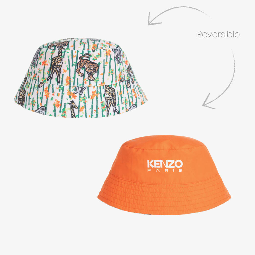 An orange and white reversible bucket hat for boys by KENZO KIDS. Made in soft cotton twill, the white side is patterned with a green and orange bamboo jungle print, with sweet giraffes, tigers and monkeys. The silky-smooth orange reverse is stamped with the designer's white logo.
