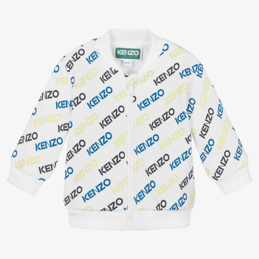 White cotton zip-up top for little boys, unmistakably by luxury French brand KENZO KIDS. Patterned with logos in shades of blue and green, it is made in stretchy jersey with cosy ribbed trims and is just right for relaxed days. It fastens with an exposed zip on the front, with a logo pull tab, and has useful, concealed side pockets.
