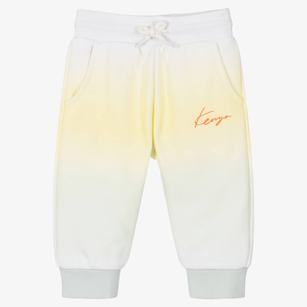 Yellow and blue gradient print joggers for little boys by French brand KENZO KIDS, with the designer's orange logo printed on one leg. Made in comfortable jersey with ribbed trims, they are ideal for relaxed wear. They have jetted front pockets and an elasticated waistband with a drawstring for a good fit.