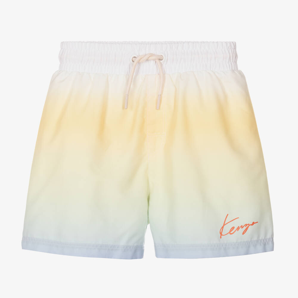 Silky smooth yellow and blue gradient swim shorts for boys by KENZO KIDS. Lined with mesh for comfort and quicker drying, the elasticated waist can be adjusted with the branded drawstring for a better fit. An orange Kenzo script logo is printed on the front for a designer finish.