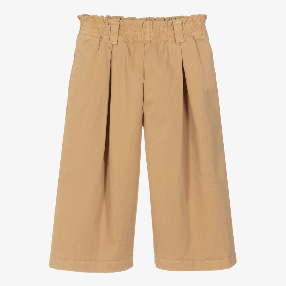 Beige cotton twill culottes for girls by luxury French brand KENZO KIDS, with the designer's logo badge embroidered on the back in blue for instant designer appeal. They are made in soft twill, with a comfortable, elasticated waist and inverted pleats on the front for shape and structure. There are useful pockets on the side seams.