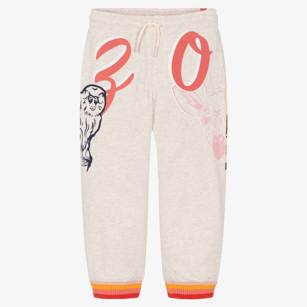 Beige marl joggers for girls by KENZO KIDS, made in soft cotton sweatshirt jersey. Printed with the brand's signature Multi Iconics in pink and yellow, they have the designer's logo printed across the front and back in a cool script design. The striped waistband is printed in vibrant colours for a playful look, and have a drawstring detail for comfort.