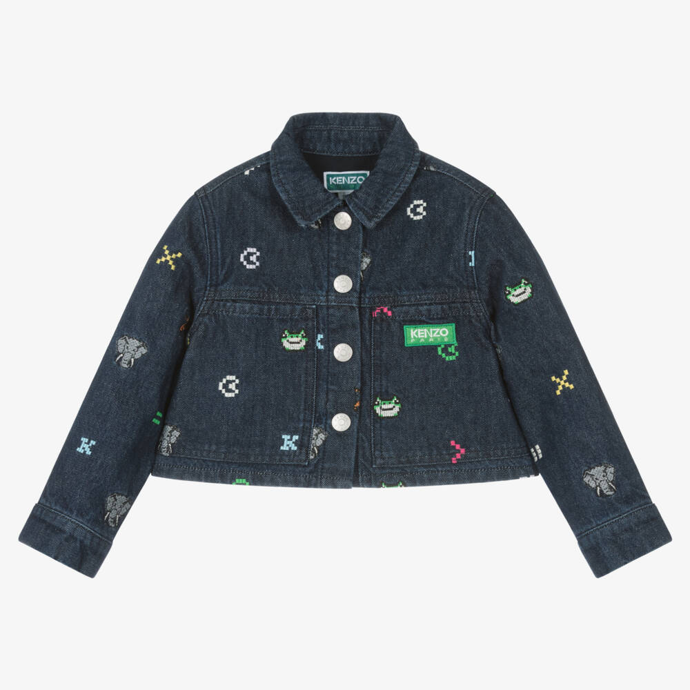 Dark blue jacket for girls by KENZO KIDS, made in soft cotton denim. In a relaxed boxy fit, it is embroidered with colourful jungle animals and logo lettering in a fun pixelated design. Fully lined for comfort, it has branded popper fastenings and a green Kenzo Paris logo badge on one of the front patch pockets for an additional designer touch.