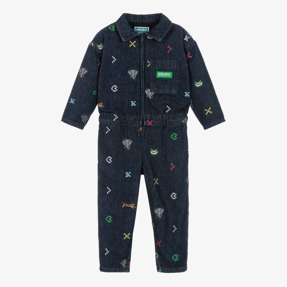 Dark blue denim jumpsuit for girls by KENZO KIDS, from the brand's Jungle Game collection. This casual, cotton one-piece is embroidered with pixelated jungle animal motifs and logo lettering in fun, bright colours. It is refined with a branded zip fastening on the front and a green Kenzo Paris logo patch on the chest pocket. Lined for comfort, the 80s-inspired design has a collared neckline, turn-up cuffs and an adjustable waist.