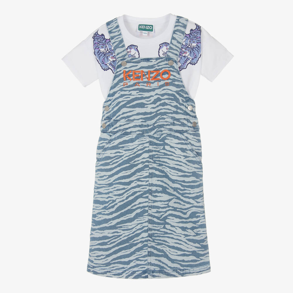 Blue and white dress set for girls by KENZO KIDS. The pinafore dress is made in soft cotton denim and has an eye-catching tiger stripe pattern and an orange embroidered Kenzo Paris logo on the front. There are branded popper fastenings on the sides and on the adjustable shoulder straps and slanted front pockets. The white T-shirt is made in soft and stretchy cotton jersey and has a blue floating tigers print on each shoulder.