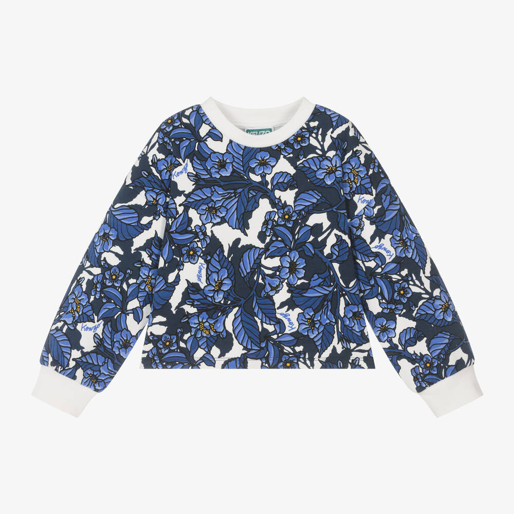Great for a bold casual look, this long-sleeved sweatshirt for girls is by KENZO KIDS. Printed with a striking blue flower pattern on a white background featuring branded details, it has white stretchy ribbed trims on the cuffs and the neckline. Made from soft mid-weight cotton jersey, it has a fleecy interior for added cosiness and warmth.