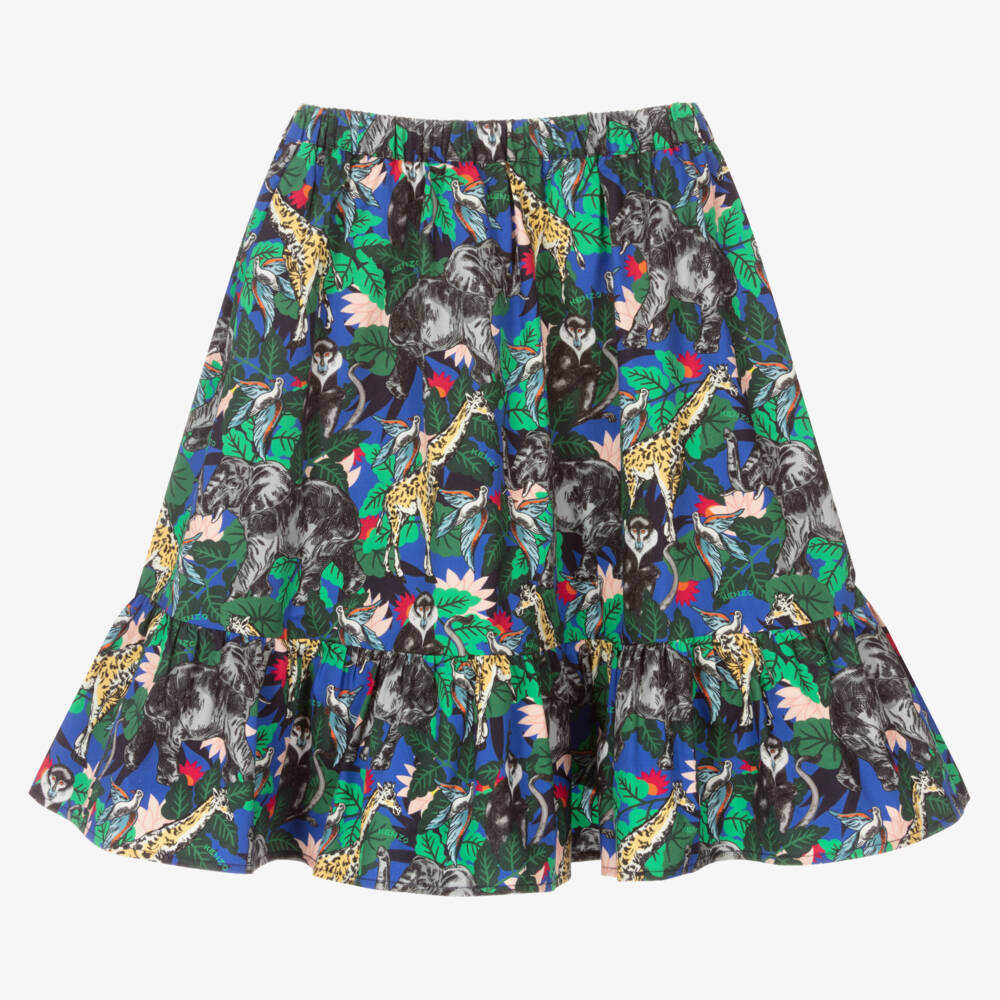 Girls blue jungle print skirt by KENZO KIDS, made in lightweight twill. It has a colourful jungle flora and fauna print with the brand's logo, a pretty frilled hemline and a comfortable elasticated waistband. There are useful, concealed pockets on the side seams.