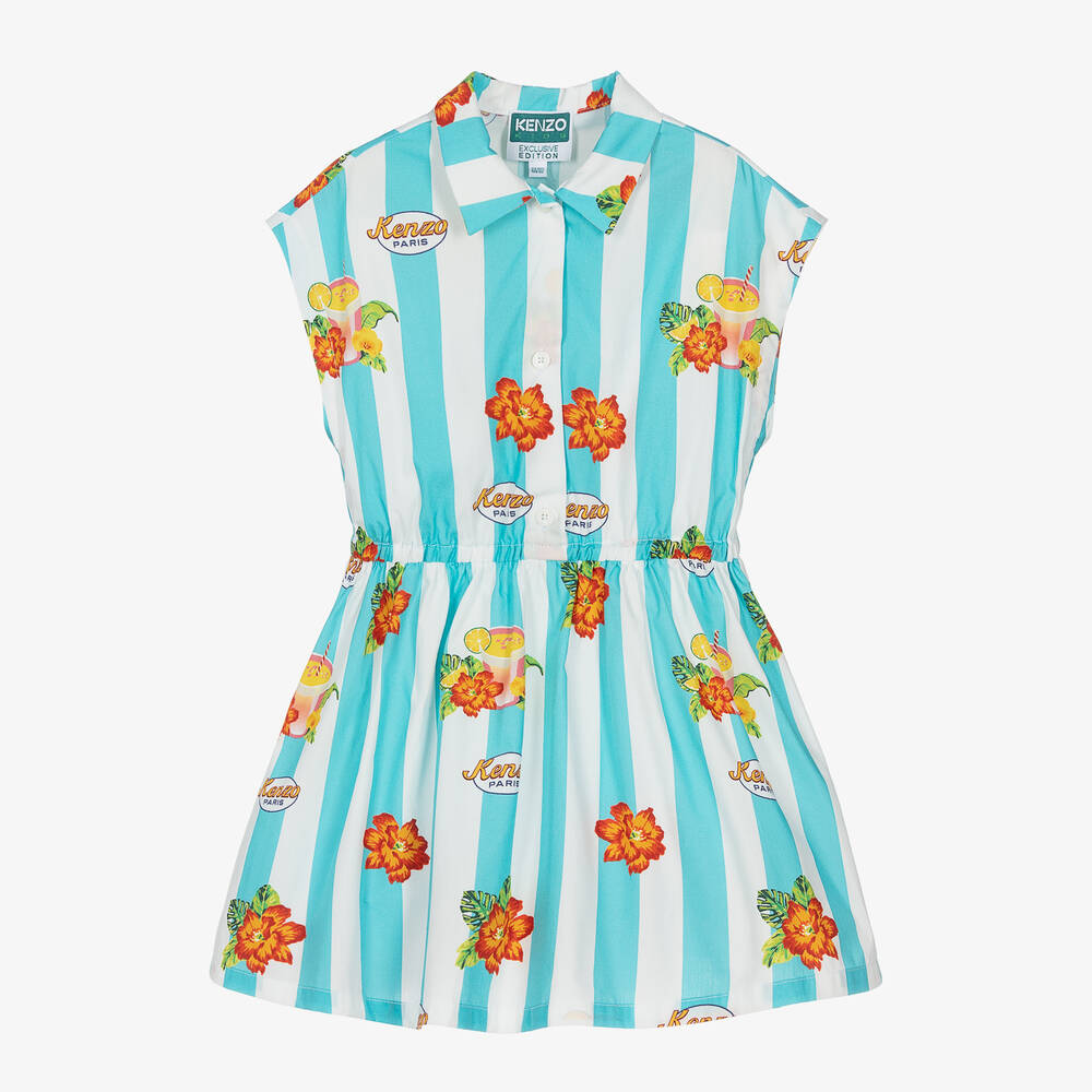 Aqua blue and white striped dress for girls by KENZO KIDS, made in light cotton poplin for comfortable wear in the warmer weather. This sleeveless style has a neat collared neckline and a buttoned placket on the bodice. The waistline is elasticated for ease of movement. Printed orange flowers and tropical drink motifs can be seen alongside the recognisable Kenzo Paris logos.