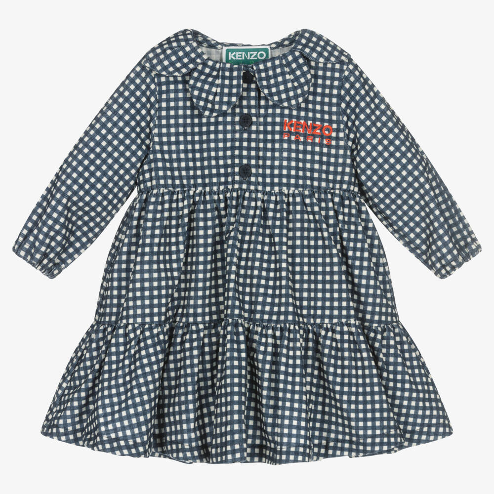 A sweet navy blue and white dress for little girls by KENZO KIDS, made in soft cotton corduroy. Patterned in the brand's signature Vichy check, this dress is boldly embroidered with a red Kenzo Paris logo. A petal-shaped collar blooms from the neckline, and there are logo-embossed button fastenings underneath.