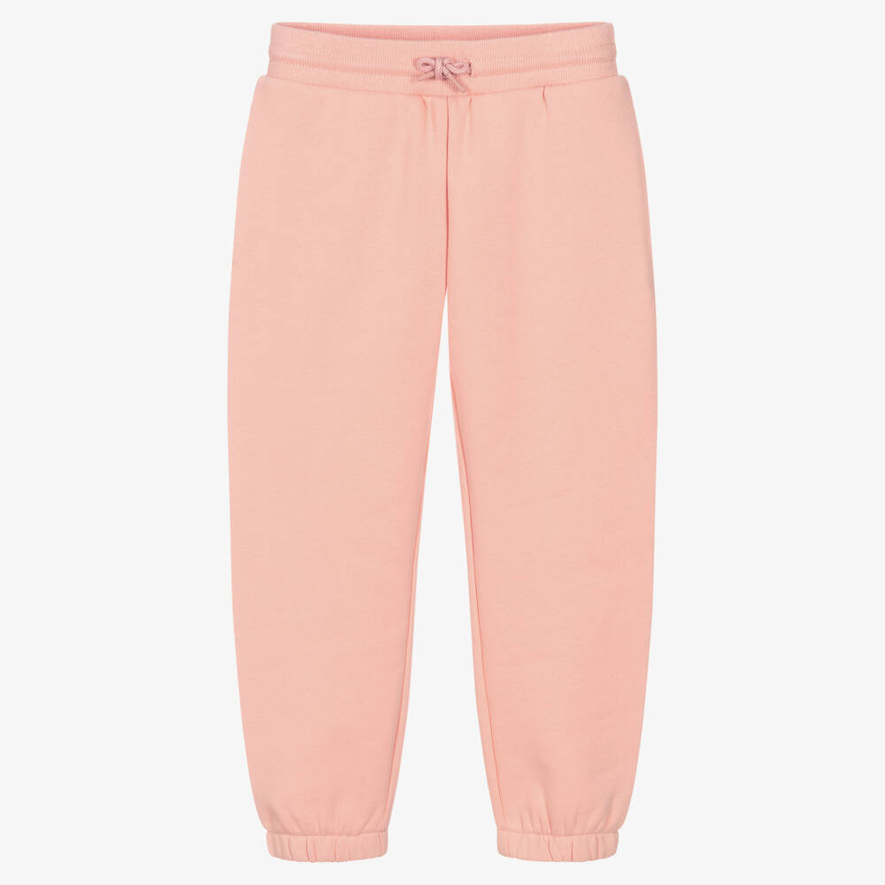A pair of coral pink joggers for girls by KENZO KIDS. They are made in medium-weight cotton-rich jersey, with a super cosy fleecy-feel underside for extra warmth. Detailed on the back is a white box logo graphic, with a hidden pocket above. These cuffed joggers have concealed side seam pockets and drawstrings on the waist for simple, fuss-free dressing.