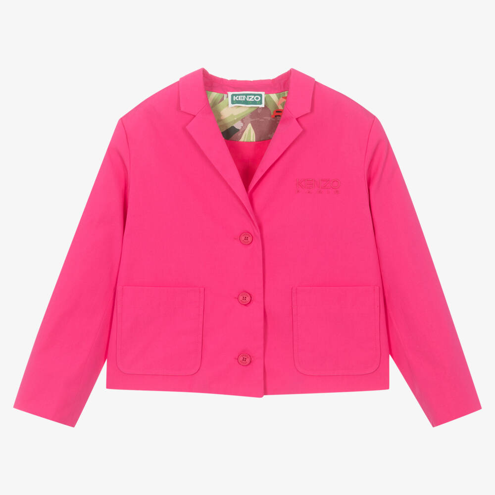 Fuchsia pink blazer for girls by KENZO KIDS, made in soft cotton poplin. Designed with a classic lapel collar, it has a tonal logo embroidered on the chest and two patch pockets on the front. Lined in lightweight cotton voile, it has branded buttons on the front and a twill panel on the inside of the collar, patterned in the brand's vibrant green house print.