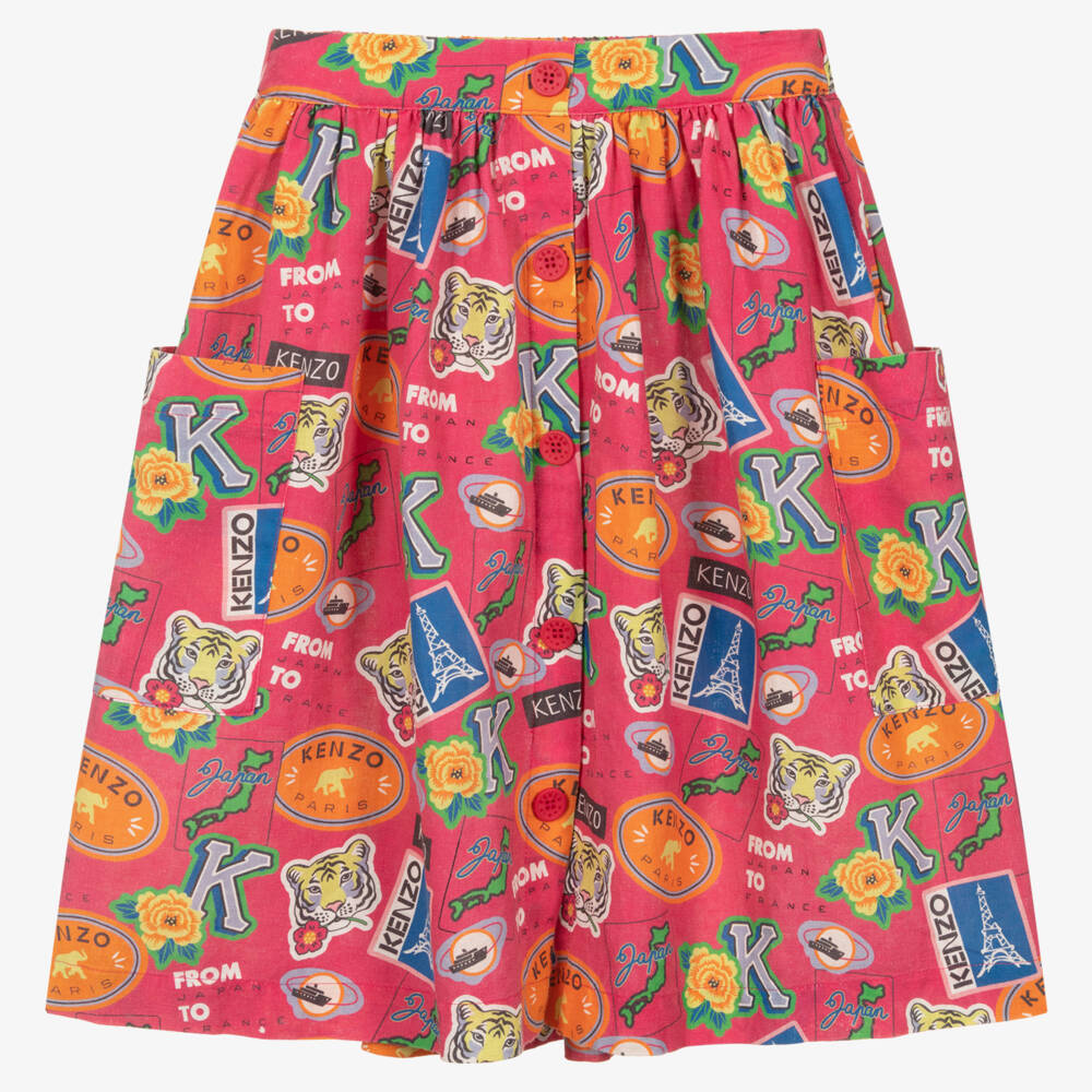 Fuchsia pink flared skirt for girls by KENZO KIDS, woven in a soft cotton and linen blend. In a quirky 80's style, it has a colourful patch logo print all-over, with a faux front opening, logo-embossed decorative buttons, and oversized pockets.