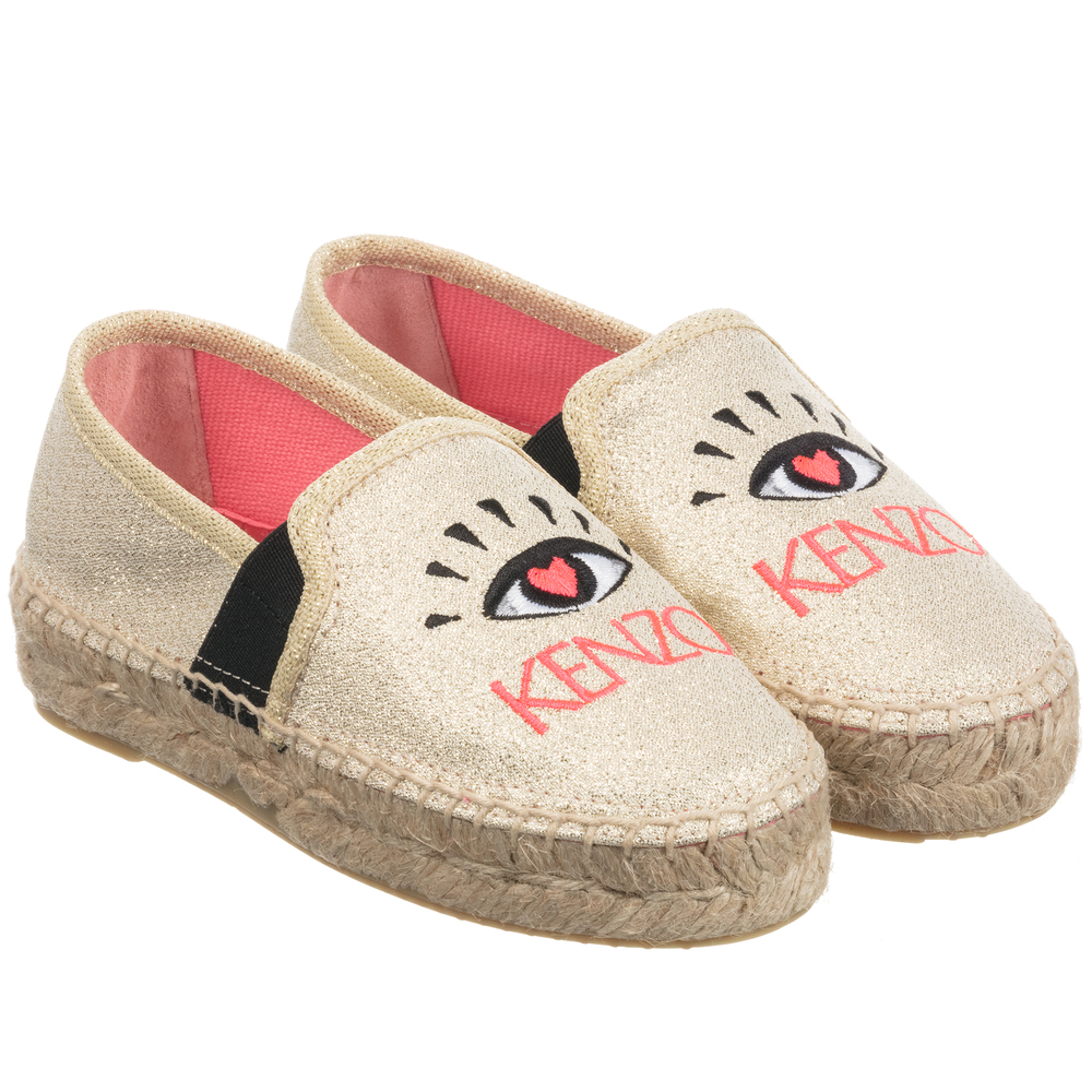 Glittery gold espadrilles for girls by Kenzo Kids, with hessian braiding on the sides. These sparkly slip-on shoes are made in soft textile and have a non-slip rubber soles. They have the brand's iconic eye embroidered in black and pink, with a pink logo name.