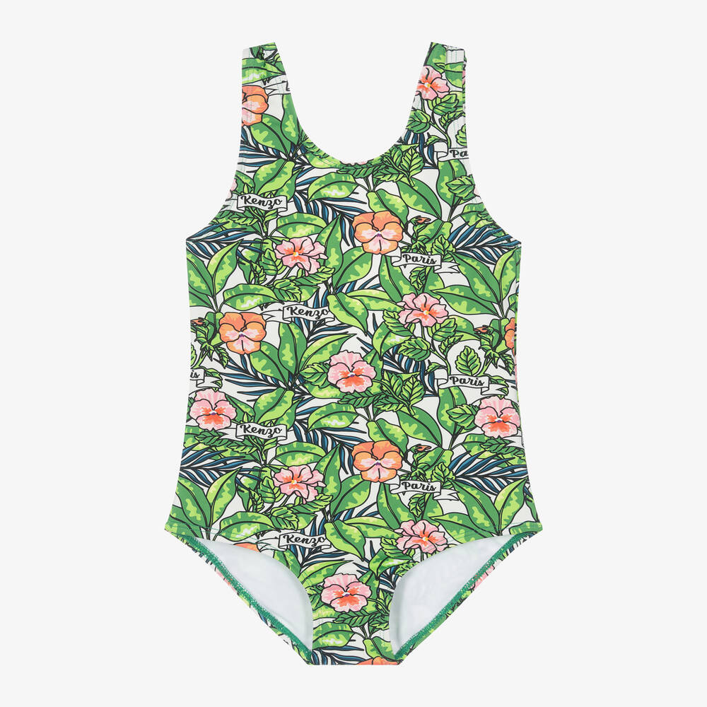 Vibrant green jungle leaf swimsuit for girls by luxury French fashion house KENZO KIDS, with pink flowers and logo banners on a white background. Silky, stretchy and fully lined for comfort, it has a stylish low back.