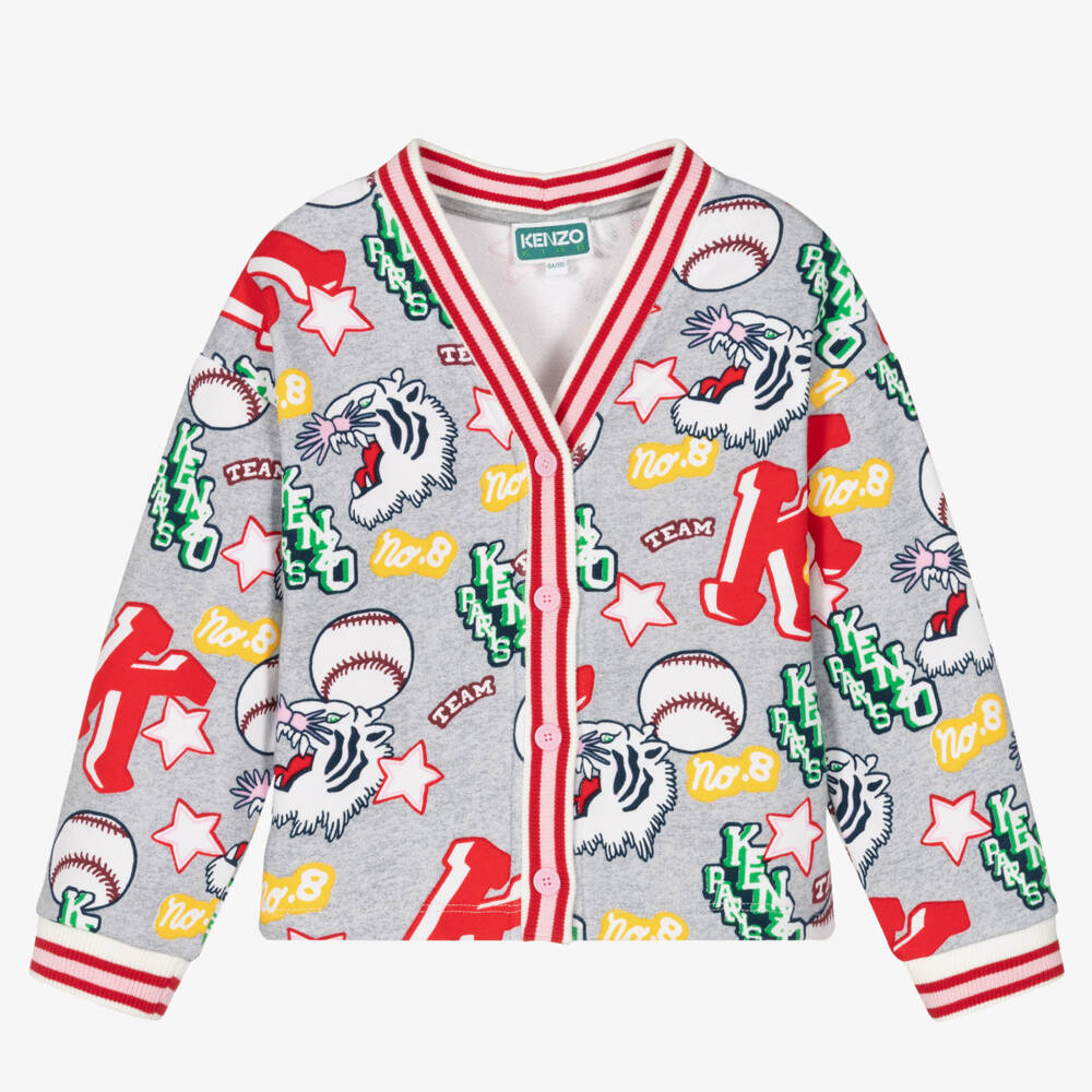 Grey marl cardigan for girls from KENZO KIDS, made in mid-weight cotton jersey. Drawing inspiration from varsity sports teams, this distinctive cardigan is designed in an all-over baseball print featuring the brand's iconic 'K' logo and the roaring Varsity Tiger motif. Striped ribbed trims, along with a V-neck and branded button fastenings complete the casual look.