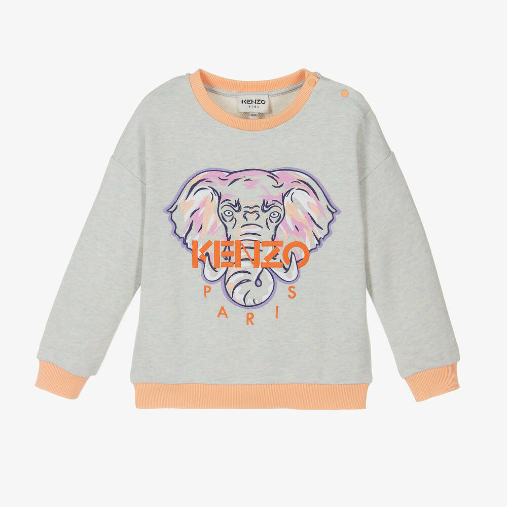 Grey sweatshirt for girls by KENZO KIDS, with a pretty blue and pink marl effect. It has the brand's iconic Elephant logo embroidered on the front in shades of pink, purple, orange and white. The cosy ribbed trims are in a coordinating coral orange colour adding a colourful, sporty look and there are useful popper fastenings on one shoulder.