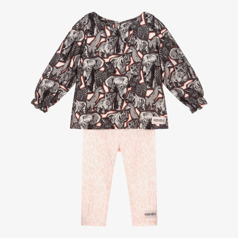 Younger girls grey blouse and pink leggings set by KENZO KIDS. The soft viscose twill blouse has a grey and pink 'Wild' print featuring various safari animals. It has a lightweight lining and button fastenings on the back. The pink leggings are made in soft cotton jersey, with a subtle leopard print and an elasticated logo jacquard waistband.