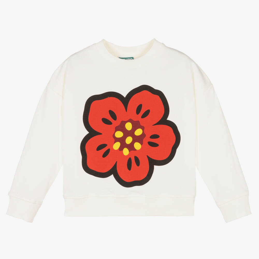 An ivory organic cotton sweatshirt for girls by KENZO KIDS, made in soft jersey for casual comfort. Reflecting house codes, the brand's Japanese Boke Flower is printed on the front in orange-red, with a black Kenzo Paris logo on the back.