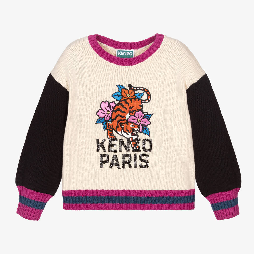 Ivory sweater for girls by KENZO KIDS, knitted in a soft cotton and wool blend. Embroidered with cartoon-style flowers, this distinctive piece has long black sleeves and magenta pink striped trims. An orange tiger on the front adds an emblematic statement, joined by a sequin Kenzo Paris logo below.