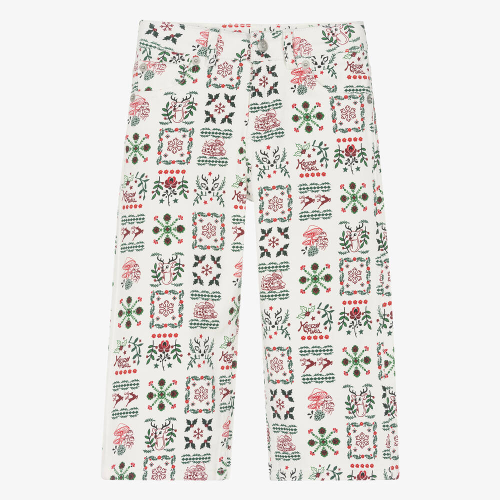 Ivory cotton trousers for girls by KENZO KIDS, in a regular straight fit. They are beautifully patterned with festive motifs in green and red, including the Kenzo Paris logo for a branded touch. Made in soft, mid-weight twill, these jean-style trousers have classic five pocket styling and fasten with a zip and button on the front. The waistband is adjustable for a comfortable fit and they have branded metalware to complete the look.
