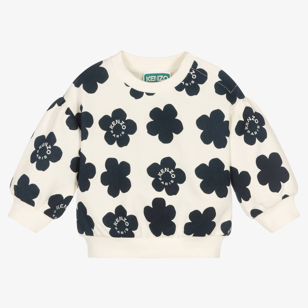 A ivory sweatshirt for little girls by KENZO KIDS, made in the softest cotton jersey blend. Cute and refreshing, this casual top is patterned in a navy blue Boke Flower design, with the brand's signature logo incorporated throughout. The sleeves are delicately puffed for sweet styling, and there are shoulder popper fastenings to finish the look.
