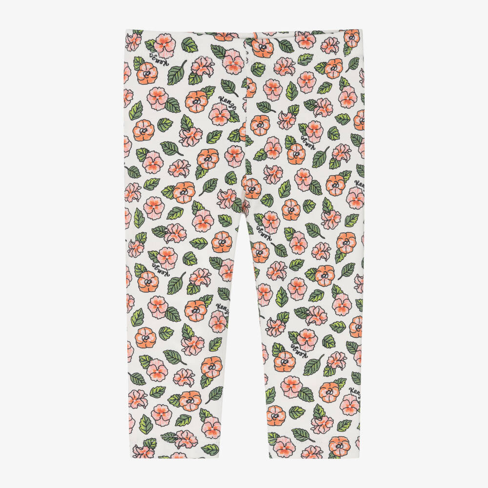 Ivory leggings for little girls by KENZO KIDS, made in soft and stretchy cotton jersey. They have a beautiful floral print in shades of pink and green, with a discreet logo patterned throughout.