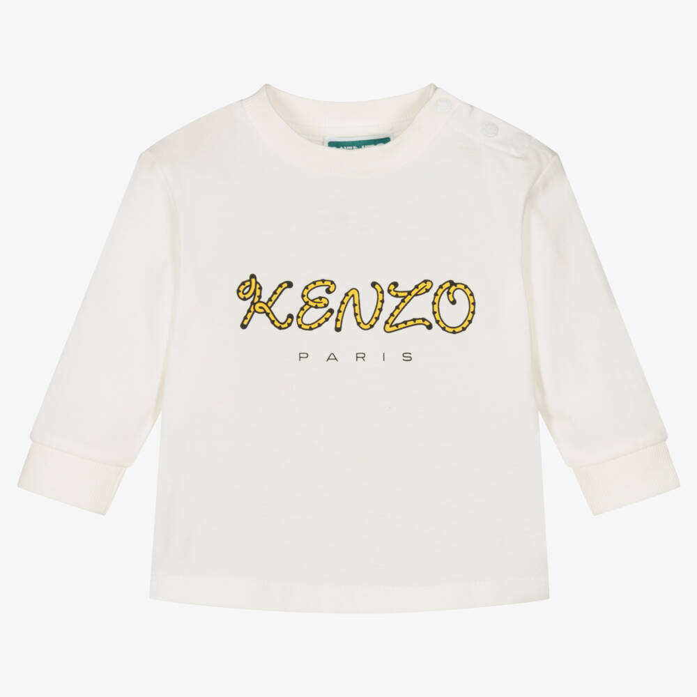 Ivory organic cotton top for little girls by KENZO KIDS, with a yellow and black Tiger Tail logo print on the front. Made in soft, comfortable jersey, it has cosy ribbed trims and popper fastenings on one shoulder to help with dressing.