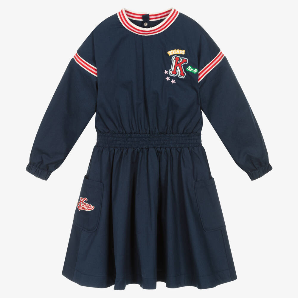 Navy blue dress for girls by KENZO KIDS, made in soft cotton poplin. With striped ribbed trims and elasticated cuffs, this long-sleeved dress has an elasticated waist and branded popper fastenings on the back. It is fully lined in lightweight cotton voile for ultimate comfort. As well as a varsity-inspired 'K' motif on the chest, there is a signature red logo embroidered on one of the side patch pockets for a collegiate feel.