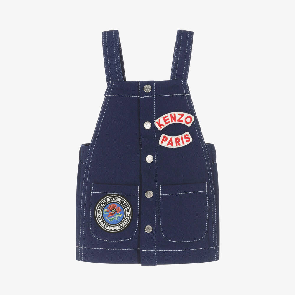 Navy blue dungaree dress for little girls by KENZO KIDS, made in soft, mid-weight cotton twill. This cute dress has an elasticated back and popper fastening shoulder straps. It has patch pockets on the front and colourful vintage, floral and logo appliqué patches. There are functional and decorative branded popper fastenings on the front.