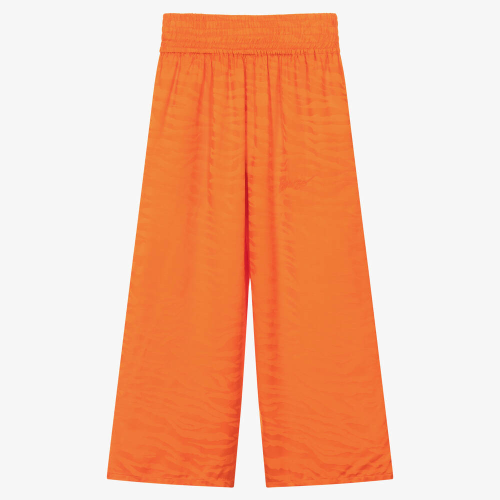 Orange wide leg trousers for girls by KENZO KIDS, made in a silky, viscose jacquard. Effortlessly chic, they are patterned in fun tiger stripes with an elasticated waistband for unrivalled comfort. They have side seam pockets and a subtle logo embroidered on the left leg for a branded finish.